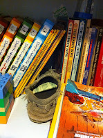 This little gem I just stumbled upon when I walked into my boys' room to look for something. I almost asked my youngest why his shoe was wedged in between books on the bookshelf when I noticed what was inside. But I took a picture instead.